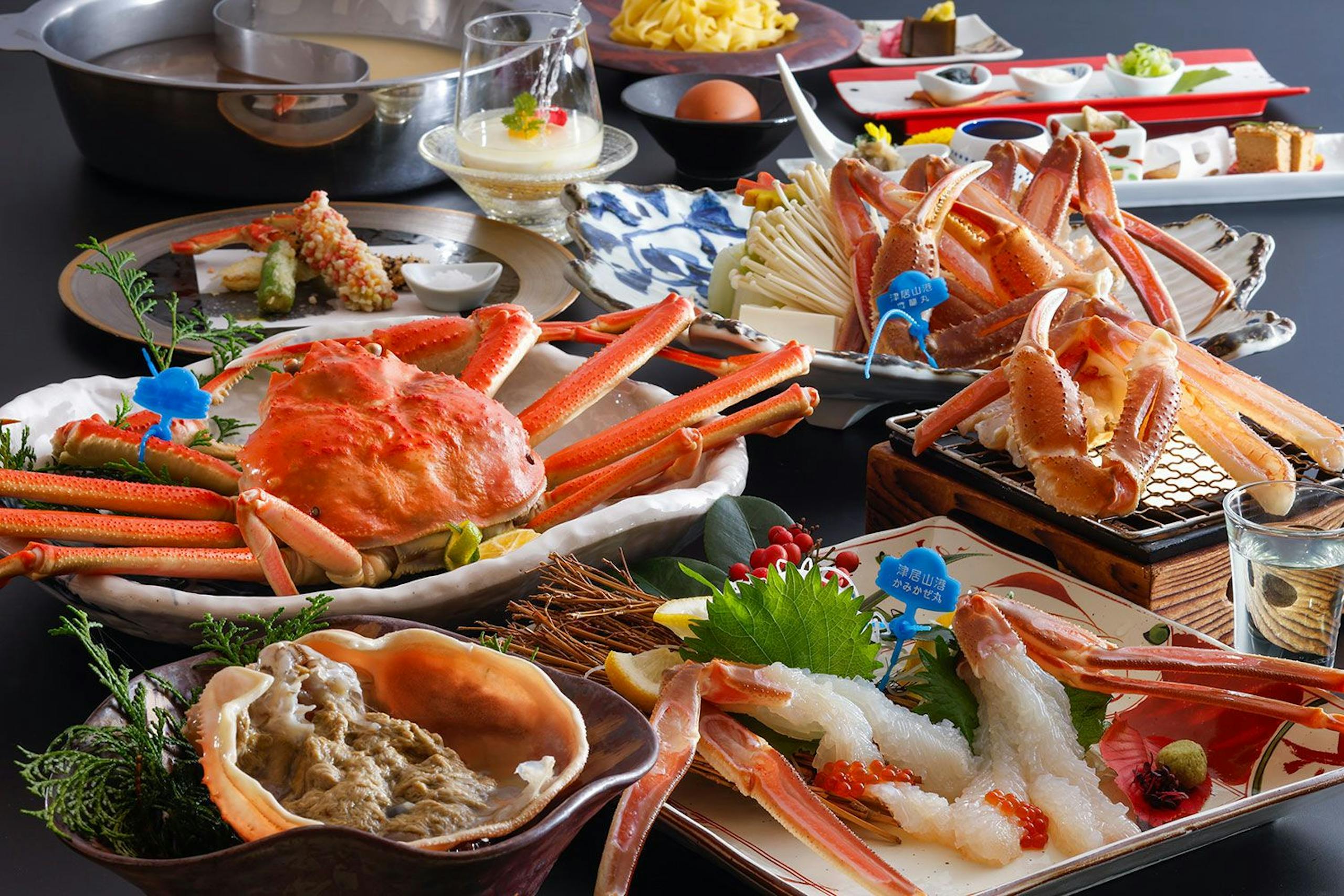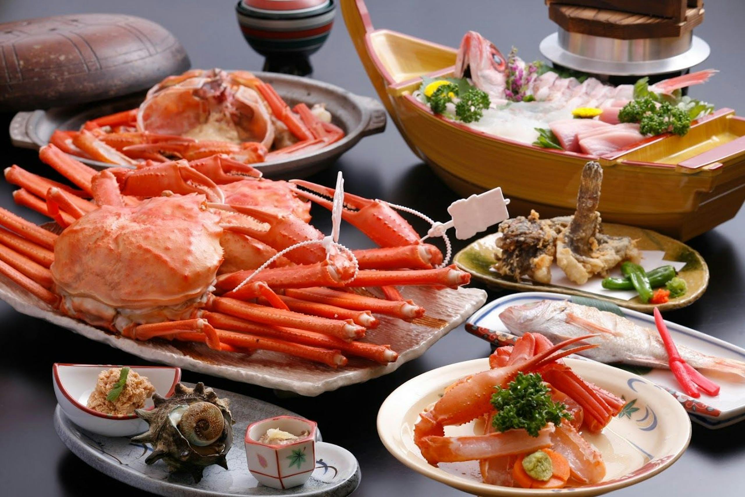 但馬牛と共に提供される海鮮会席では、地魚やカニなど新鮮な食材が存分に楽しめます。